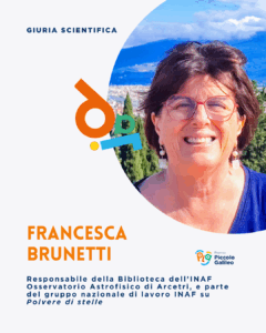 Francesca Brunetti, responsabile della Biblioteca dell’INAF Osservatorio Astrofisico di Arcetri, fa parte del gruppo nazionale di lavoro INAF su Polvere di stelle, il portale web dei beni culturali dell’astronomia italiana. Partecipa alle attività di outreach e di disseminazione della cultura scientifica ad Arcetri e all’Istituto Nazionale di Astrofisica. Esperta di letteratura divulgativa per bambini e ragazzi, collabora con LiBeR da venti anni e scrive libri per bambini e ragazzi.