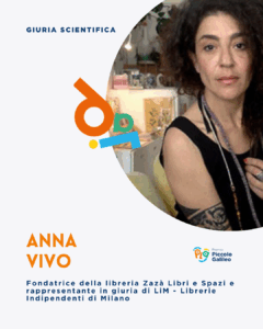 Anna Vivo ha formazione artistico-umanistica che le ha permesso di esplorare il mondo della cultura a 360 gradi. Inizialmente, ha portato avanti la sua ricerca artistica sperimentando diversi linguaggi e connessioni tra i mezzi espressivi del tempo cioè video, performance, fotografia e installazione. Successivamente, si è concentrata sul teatro, specializzandosi nella progettazione dei costumi di scena sia per il teatro di Prosa che Opera Lirica e infine Musical. Nel 2019 ha aperto Zazà Libri e Spazi, una libreria indipendente e un laboratorio dedicato ai bambini, nel quale cerca di dare corpo a tutte le sue passioni. Rappresenta in giuria LiM – Librerie Indipendenti di Milano.