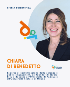 Chiara Di Benedetto si occupa di progetti di comunicazione per la ricerca e la scienza, con particolare attenzione alle attività di sensibilizzazione e public engagement. Collabora con numerose organizzazioni italiane e internazionali, tra cui enti di ricerca, parchi naturali, parchi faunistici, per i quali elabora strategie di comunicazione e progetti interdisciplinari per raccontare la scienza attraverso codici artistici e narrativi. È docente a contratto all’Università di Padova e all’Università Statale di Milano. È co-founder di Studio Bleu, agenzia con sede a Padova e attiva in campo nazionale. Dal 2022 è Presidente di Giuria del Premio Piccolo Galileo.